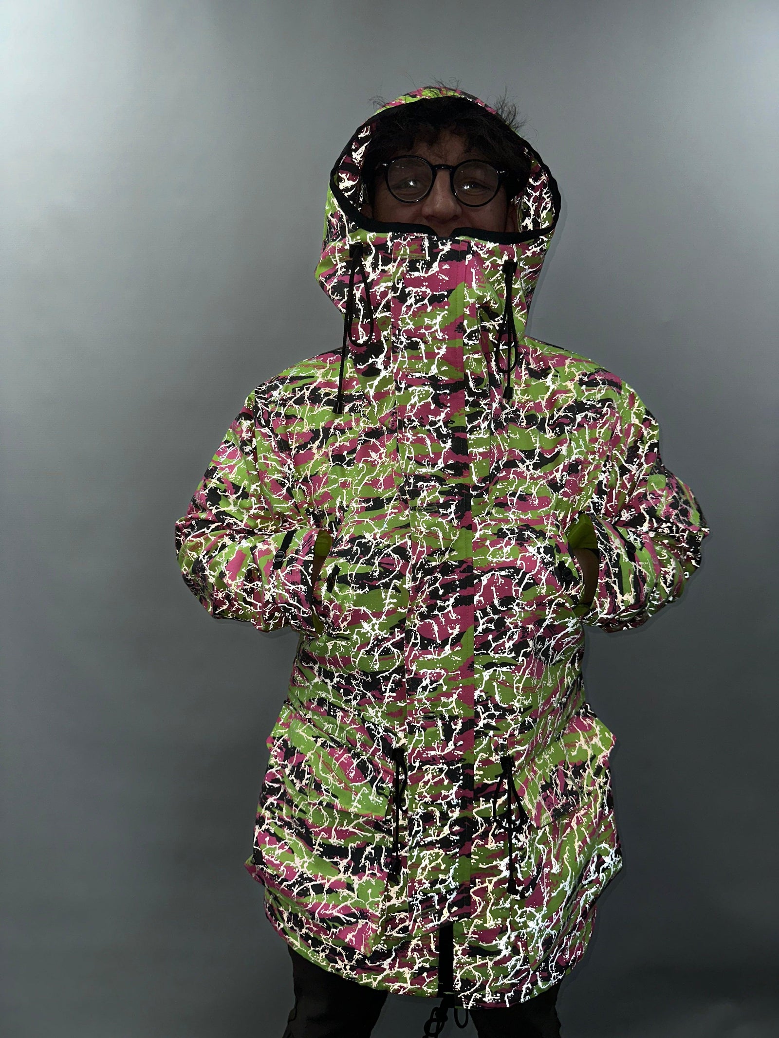JL-EQ began with a passion for creating innovative, British-made outerwear designed to perform in any environment. This image marks a pivotal moment in my journey—the first-ever sample of my neon camo smock, developed at Grade House in London. This initial design was inspired by a desire to blend practicality with style, tailored for equestrians and those influenced by the raw edge of music culture.